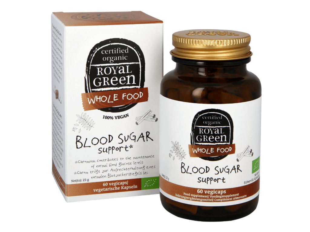 Tento produkt je primárne určený na podporu optimálnej hladiny cukru v krvi. Royal Green poskytuje 100% certifikovaný organický chróm (z listov kari a petržlenu), pretože chróm je esenciálny minerál, ktorý napomáha inzulínu regulovať hladinu cukru v krvi. Chróm tak pomáha udržiavať normálnu hladinu cukru v krvi a prispieva k energetickému metabolizmu. Niektoré štúdie naznačujú, že doplnky výživy obsahujúce chróm môžu pomôcť ľuďom s cukrovkou znížiť hladinu cukru v krvi. V bežných doplnkoch výživy sa používa synteticky vyrobená organická zlúčenina chrómu.