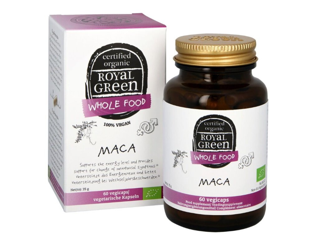 Maca, prezývaná aj ako peruánsky ženšen, je koreňová plodina - afrodiziakum Inkov, ktorá rastie v Andách v Peru v nadmorskej výške 3500 – 4300 metrov. Vďaka tomu je Maca najvyššie pestovanou rastlinou na svete! Royal Green maca je pestovaná v certifikovanej bio kvalite až 8 mesiacov, po zbere sa vysuší a ručne vyberie podľa veľkosti a farby (čierna, fialová a žltá). Royal Green používa až 80 % čiernych, 15 % fialových a 5 % žltých koreňov maca. To poskytuje najširší možný profil aktívnych živín a ponúka MAXIMÁLNY účinok.
